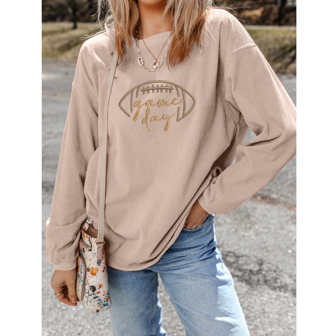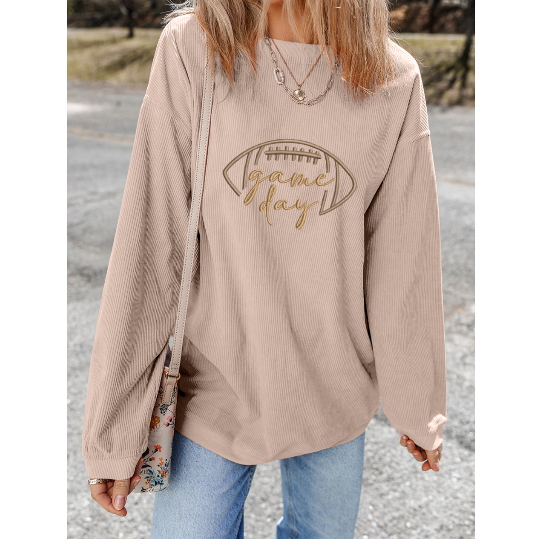 Show your love for football season in the comfiest way possible with the Tailgate Ready Corded Pullover! This lightweight, ribbed knit sweatshirt features an embroidered "Game Day" graphic on a neutral corded fabric that's effortlessly soft with a worn-in feel. The relaxed fit and drop shoulders give it a laid-back, cozy vibe perfect for tailgates, bleachers, or couch-side cheering. Whether you're repping your team or just in it for the snacks—this one's a touchdown!