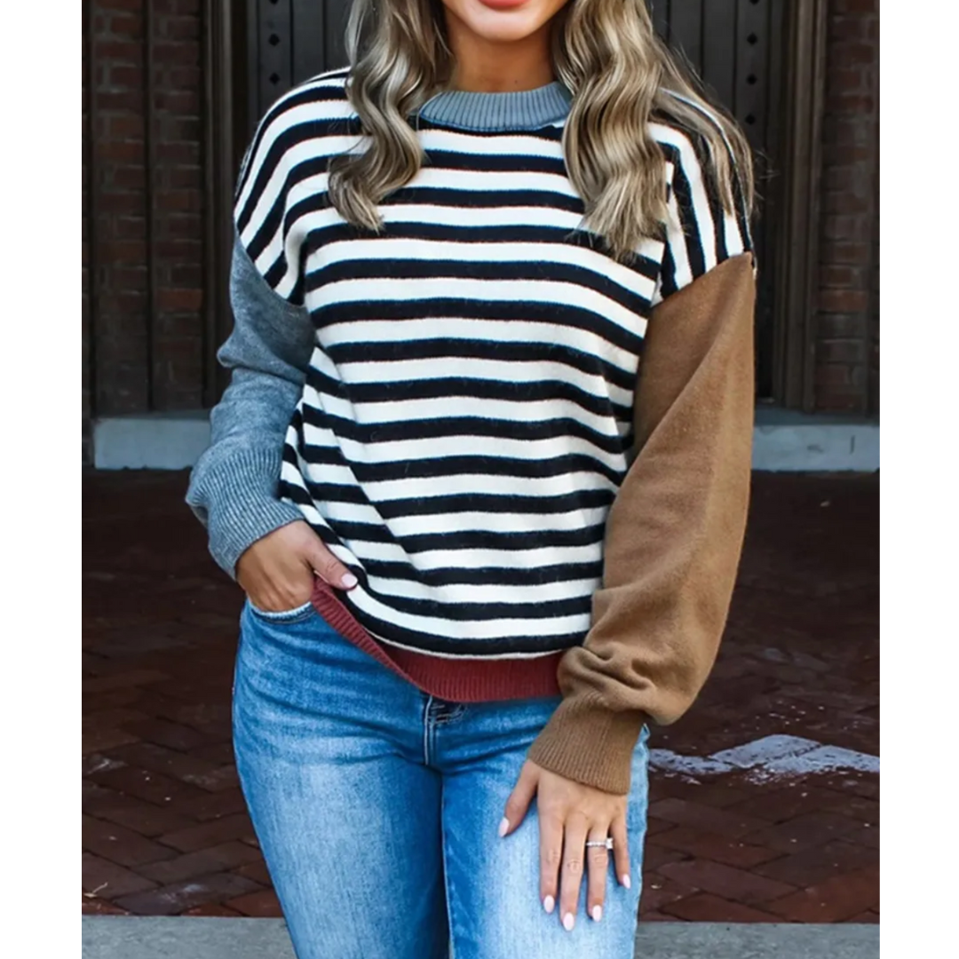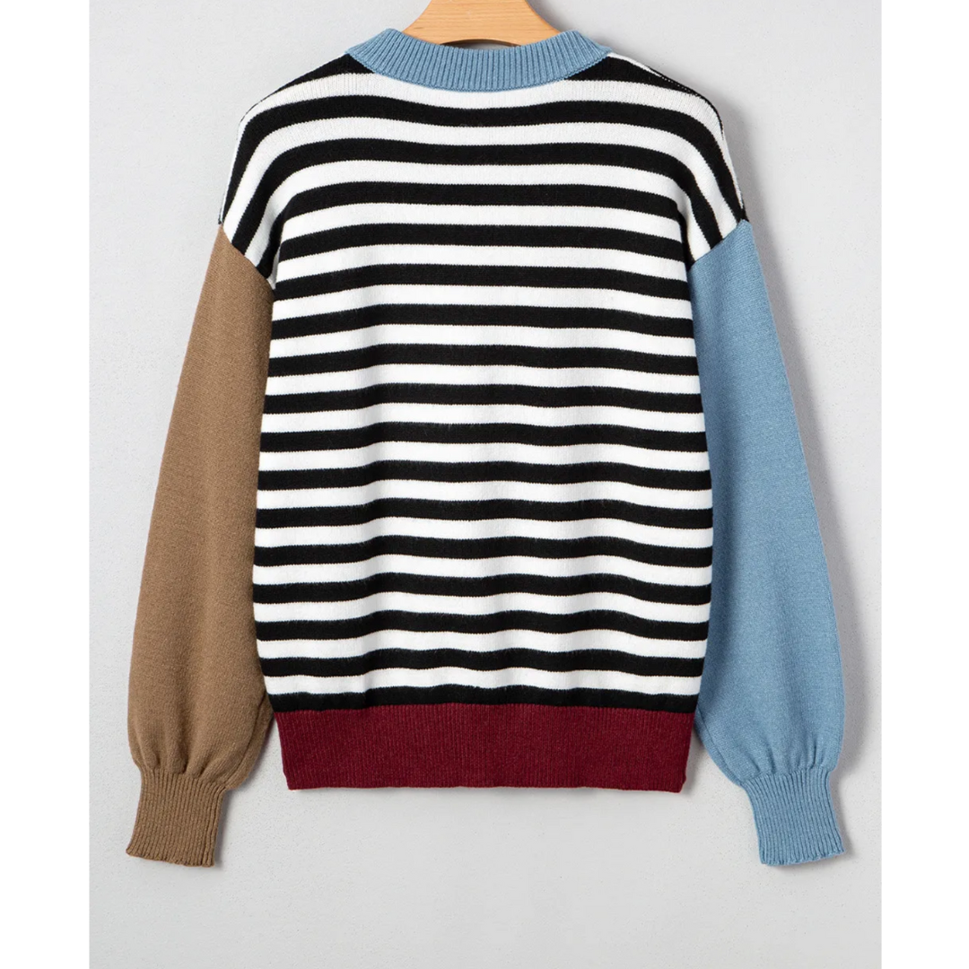 Bring playful charm to your wardrobe with the Autumn Contrast Stripe Sweater. Featuring bold black and white stripes across the body, this cozy knit is made unique with its mismatched sleeves—one in a warm caramel brown, the other in a cool gray-blue tone. A ribbed neckline in soft sky blue and a deep wine-red hemline complete the eye-catching look. Perfect for pairing with denim, boots, or sneakers, this sweater is the ultimate blend of comfort and modern style.