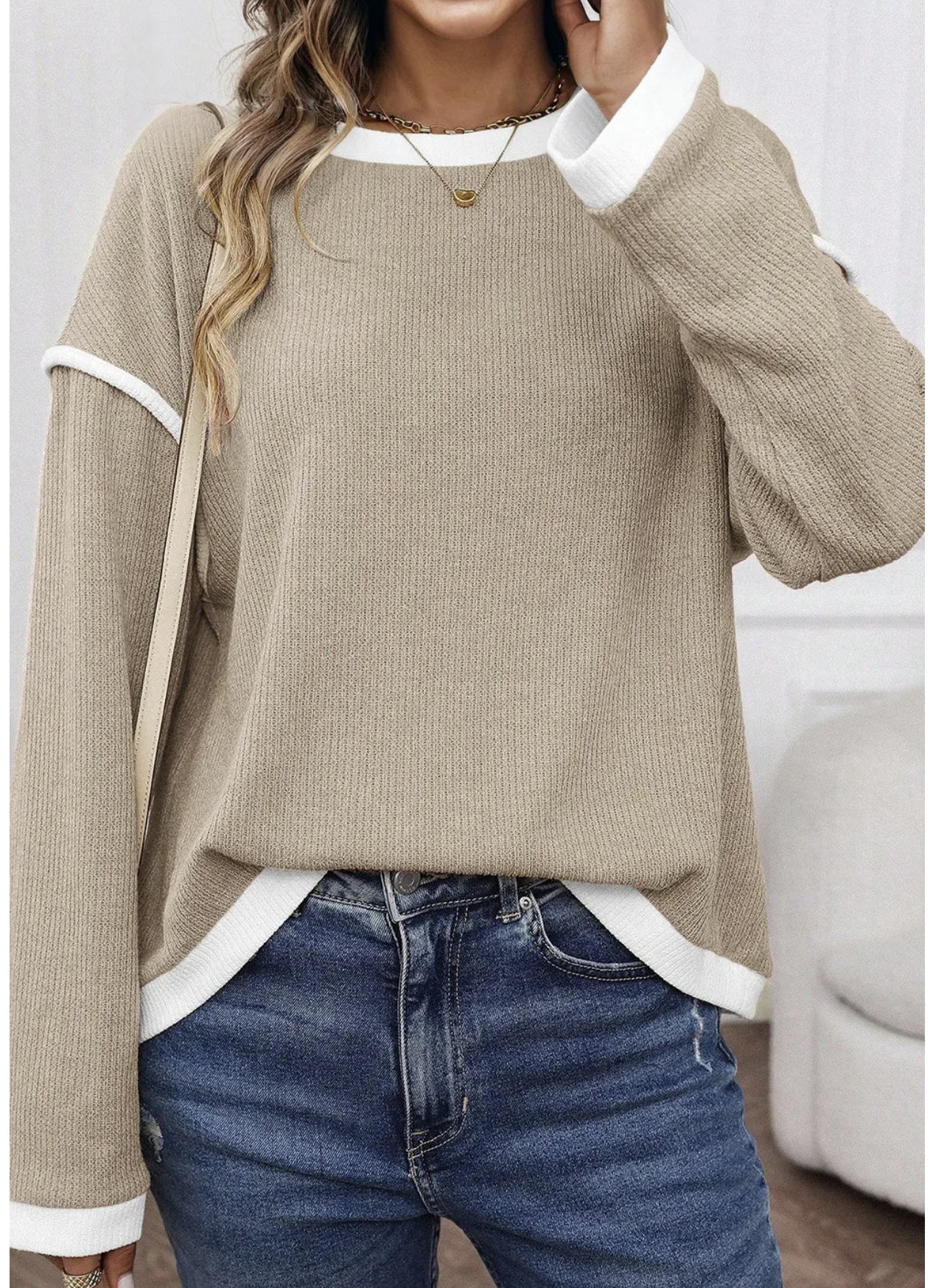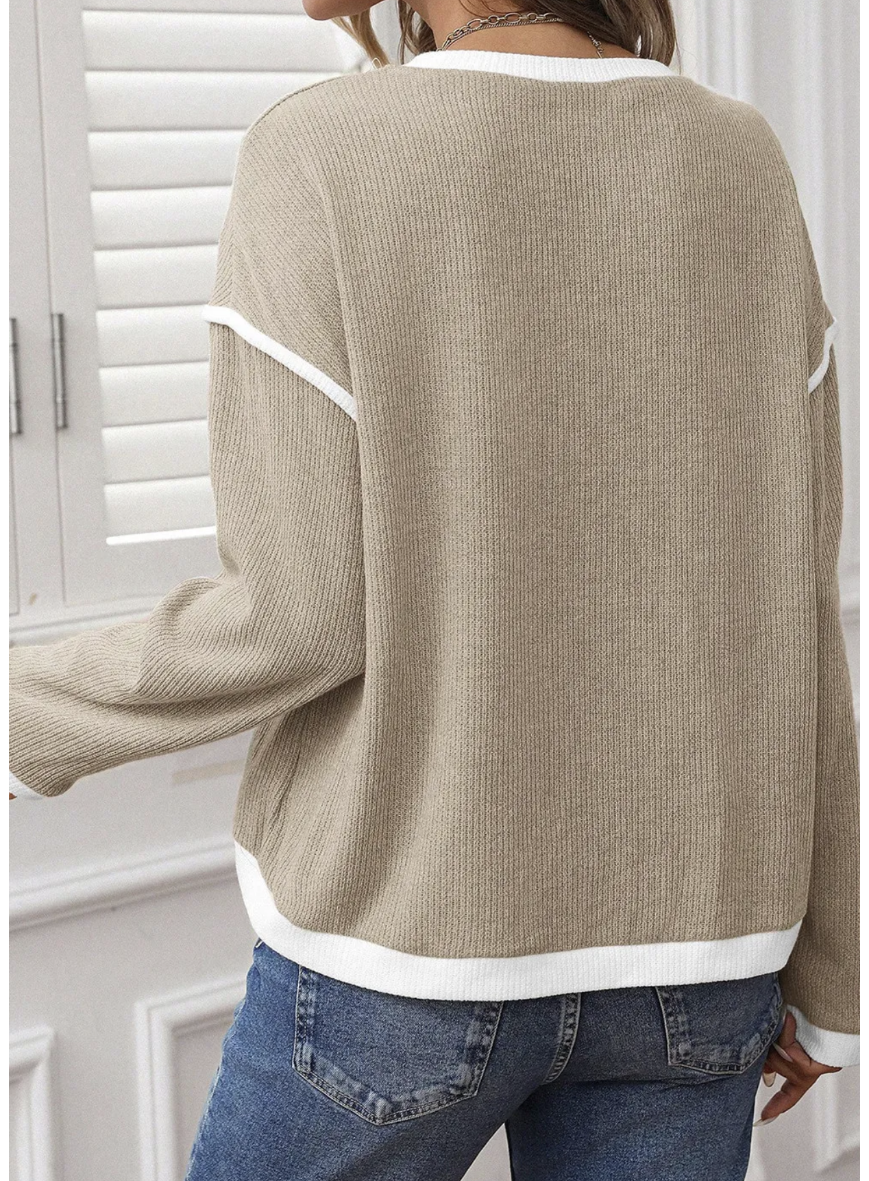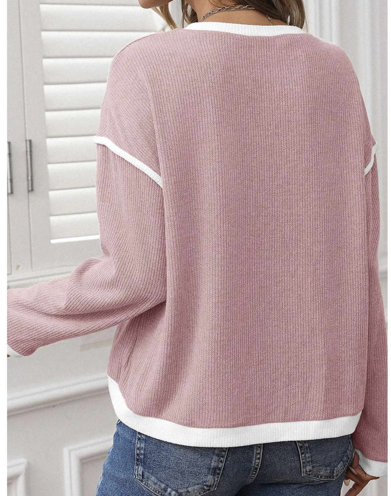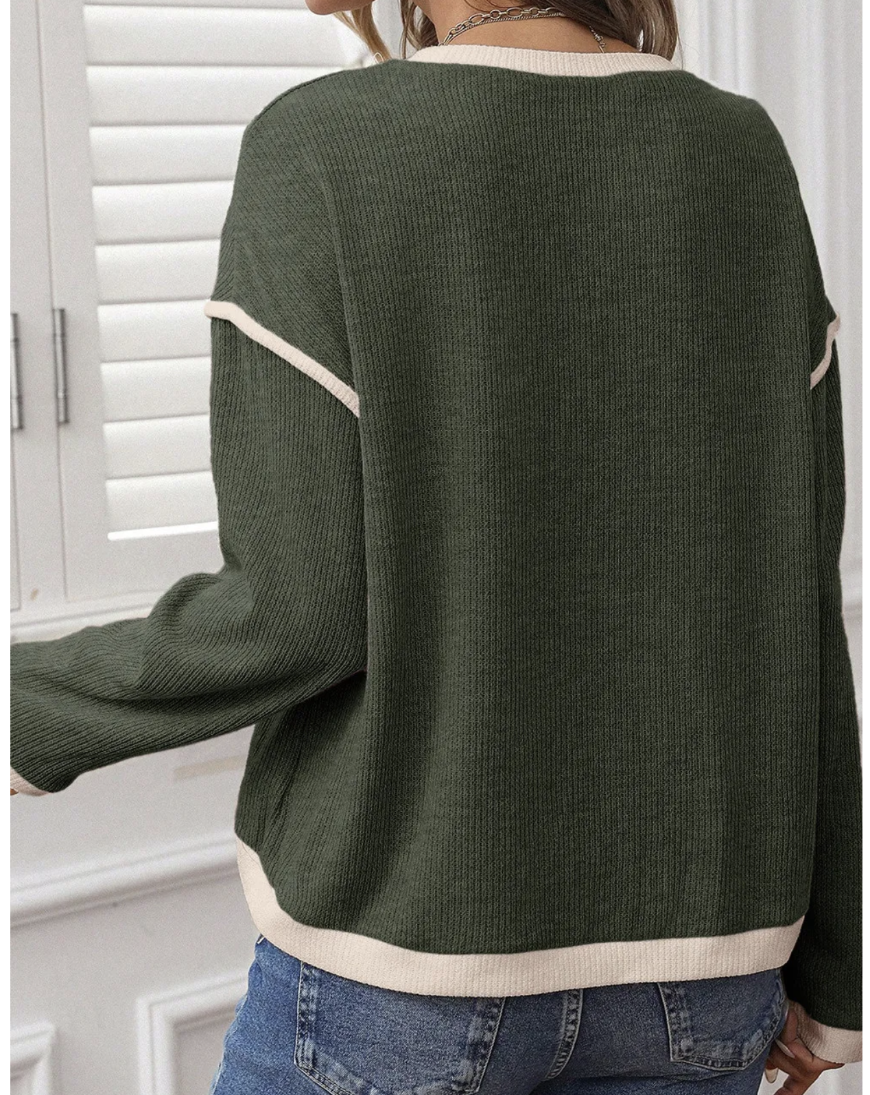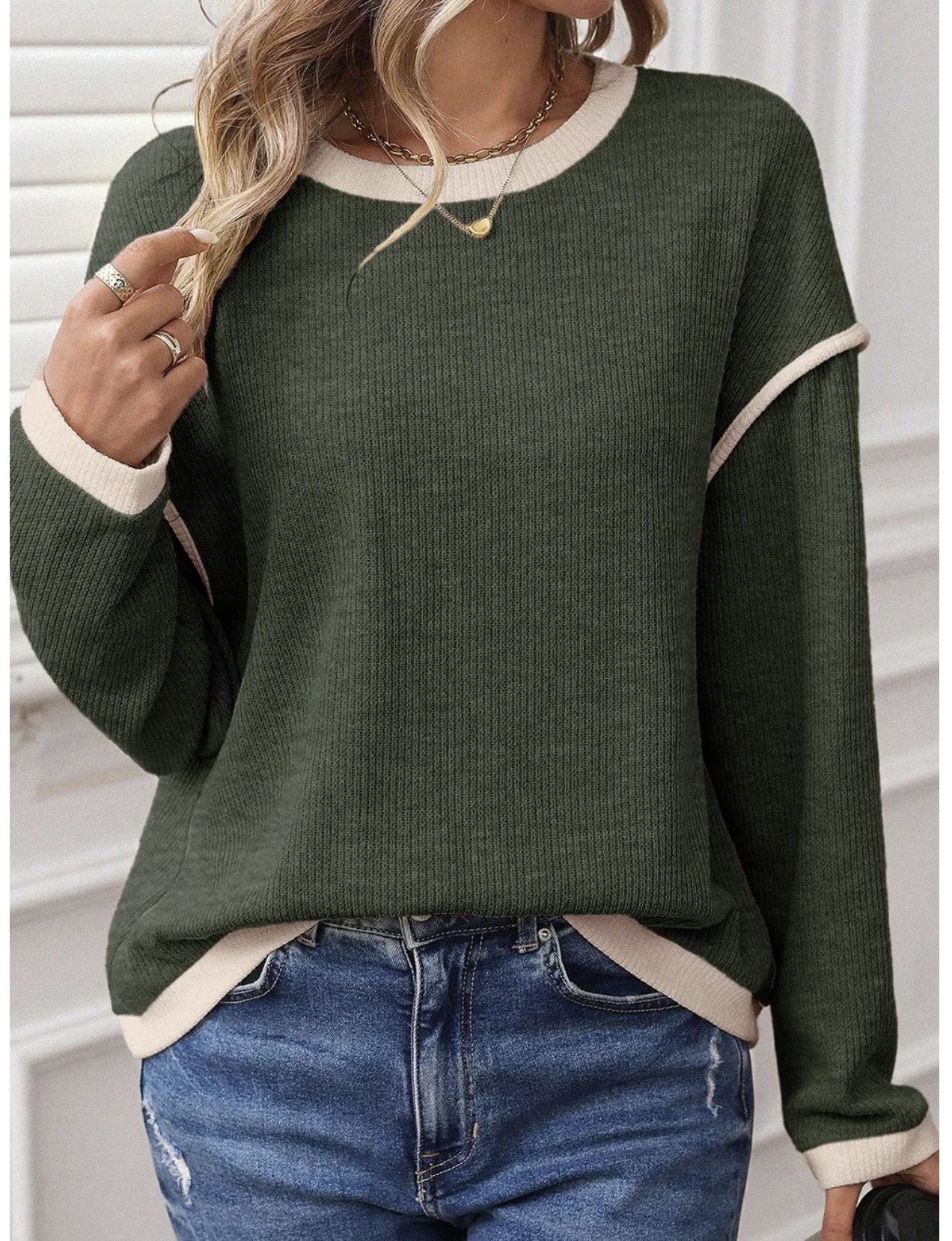 Elevate your casual style with the Contrast Charm Knit Top – the perfect blend of comfort and chic detail. Designed with a soft ribbed texture, this relaxed-fit long sleeve top features bold contrast trim along the neckline, cuffs, hem, and sleeves for a touch of playful sophistication. Whether you choose the soft blush pink, classic taupe, or deep forest green, this versatile top pairs effortlessly with jeans, joggers, or skirts for a polished yet laid-back look.