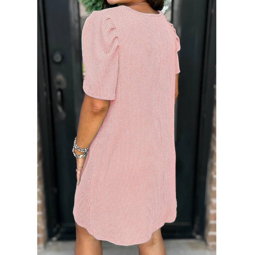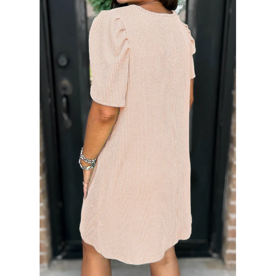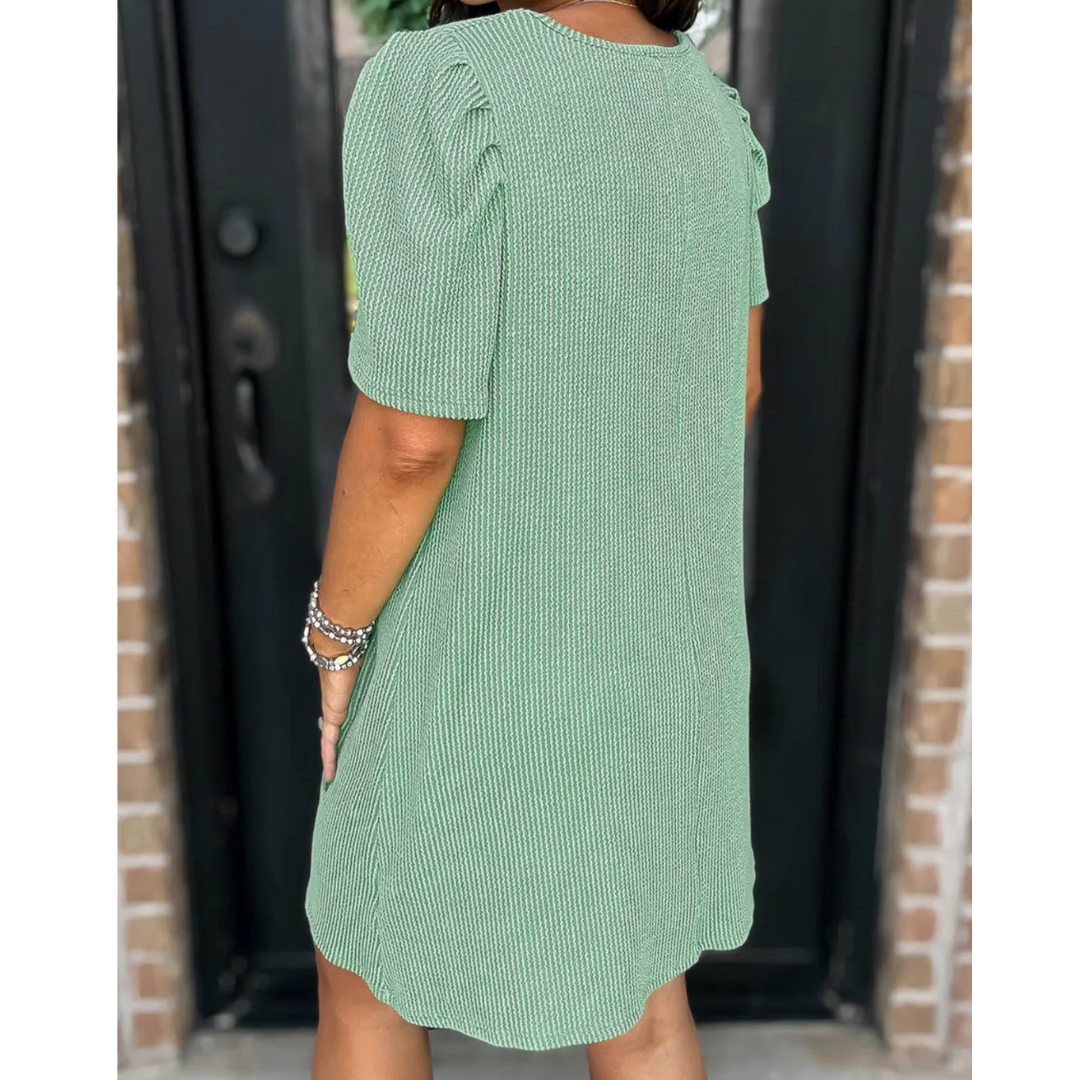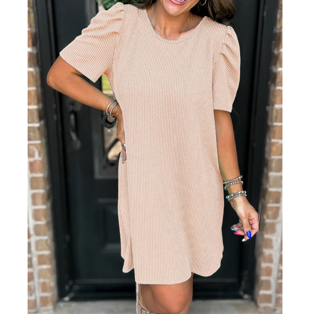 Effortlessly chic and endlessly versatile, the Everyday Charm Dress is your go-to piece for casual days, coffee runs, or an afternoon out with friends. Its lightweight ribbed knit fabric flows with comfort while the soft puff sleeves add a touch of feminine elegance. Whether you choose sage green, blush pink, or warm beige, this dress is made to flatter and keep you stylish without trying too hard.