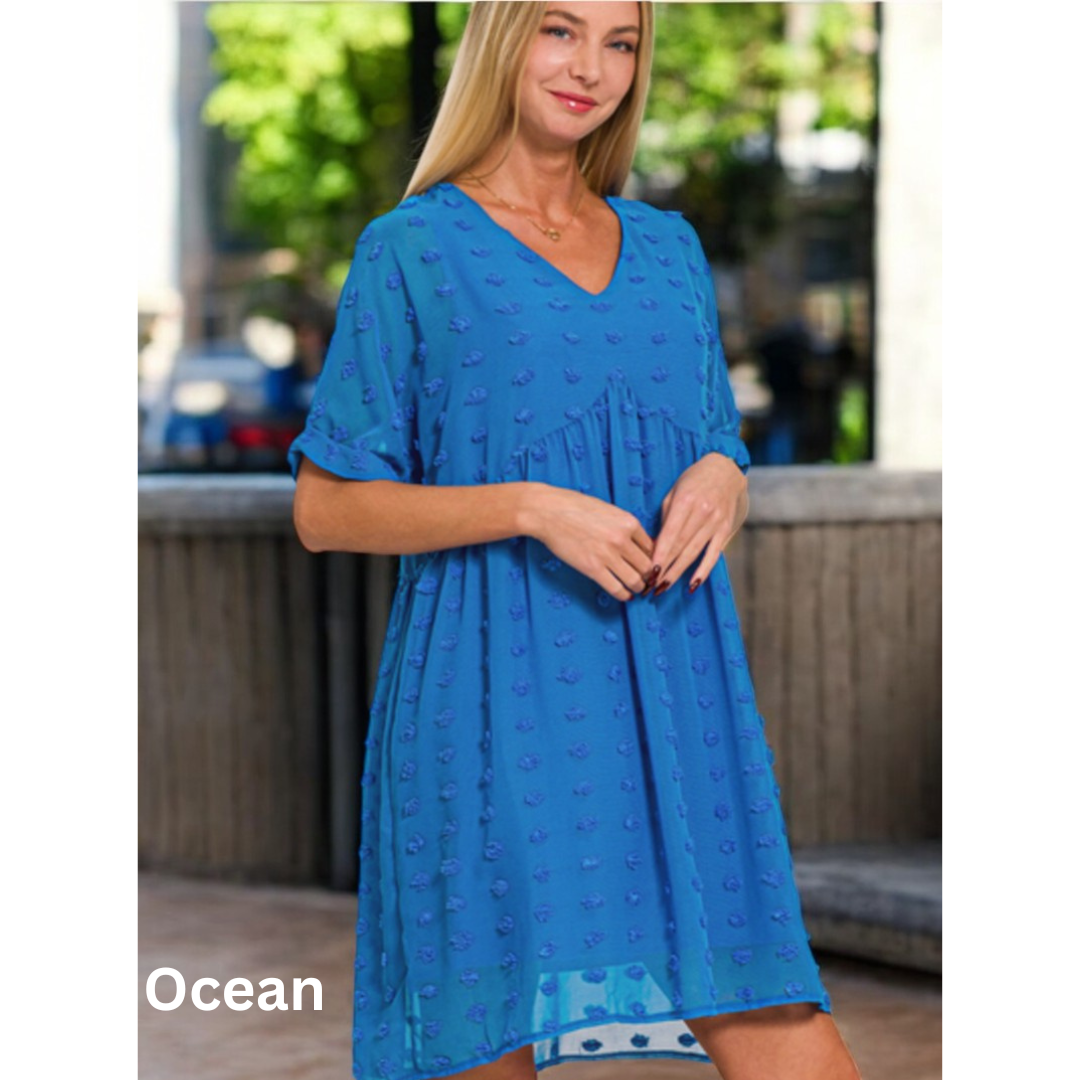Unleash your style with 'The Skies The Limit' Short Sleeve V Neck Babydoll Dress. Embrace the flattering silhouette and versatile style that exudes comfort. Crafted from luxurious Swiss Dot fabric, this dress features Short Semi Sheer sleeves, fully lined for a relaxed fit. Available in beautiful colors, this dress is a must-have for those who appreciate both fashion and comfort. Elevate your wardrobe with this stunning piece today!