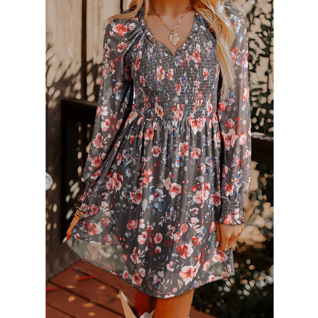 Step into effortless elegance with the Twilight Bloom Smocked Dress. Featuring a soft charcoal-gray base adorned with vibrant pink, red, and blue floral prints, this dress is perfect for every season. The smocked bodice hugs your shape while the flowy skirt and sheer long sleeves bring a touch of romance. Whether you’re strolling at sunset or heading out for brunch, this piece makes every moment feel like a blooming escape.