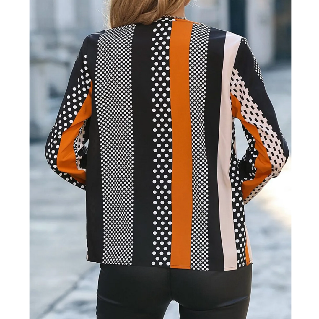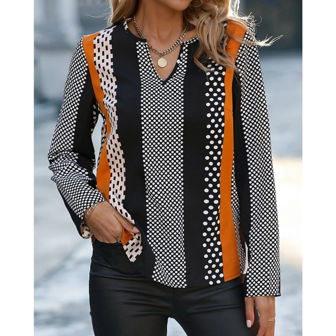Turn heads in the Urban Rhythm Blouse, where bold patterns meet modern sophistication. Featuring a dynamic mix of stripes and polka dots in striking black, white, and burnt orange, this blouse is designed for women who love to stand out. The V-neckline adds a touch of elegance, while the relaxed fit ensures comfort without compromising style. Perfect for pairing with sleek trousers, skirts, or denim, it transitions effortlessly from office chic to evening glam.