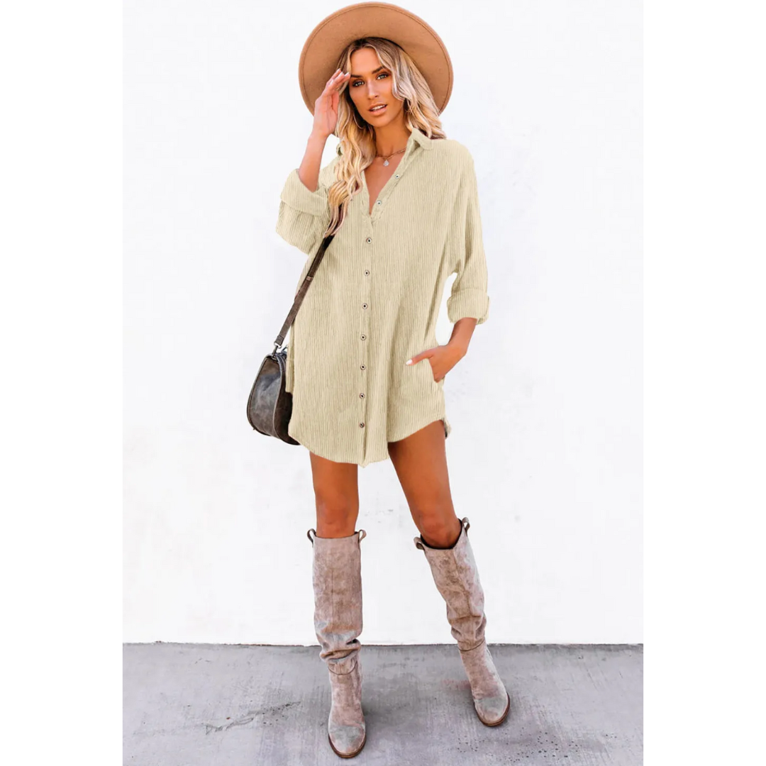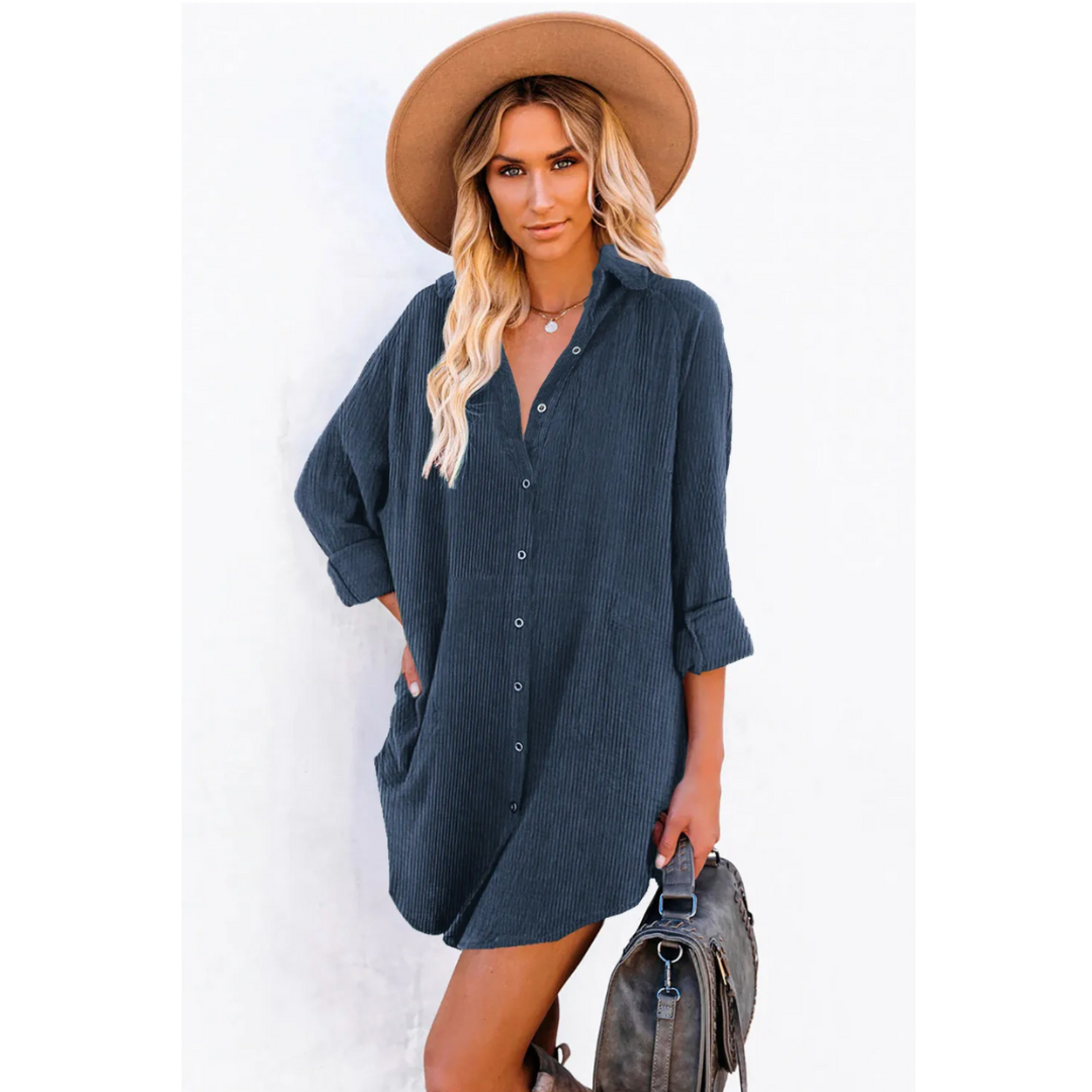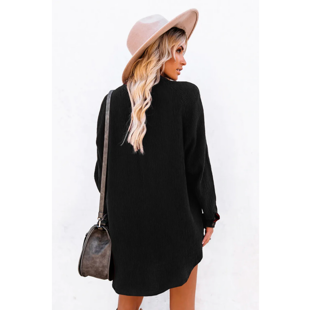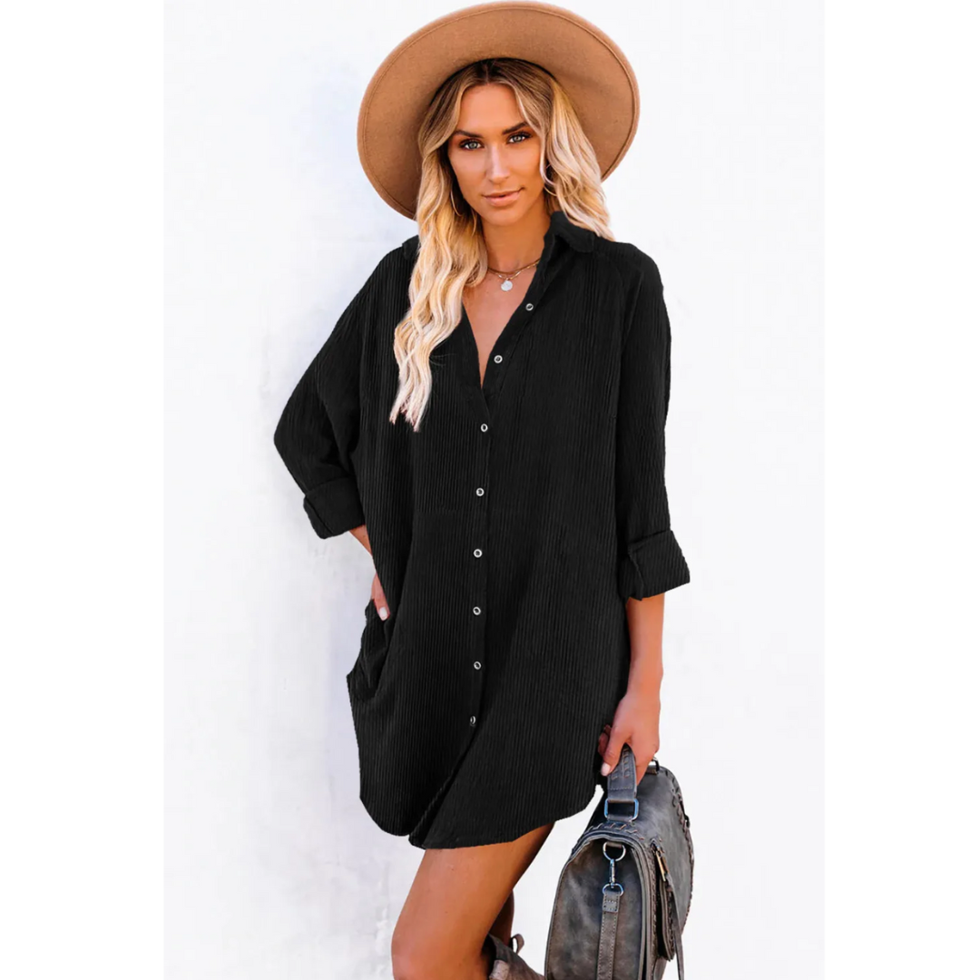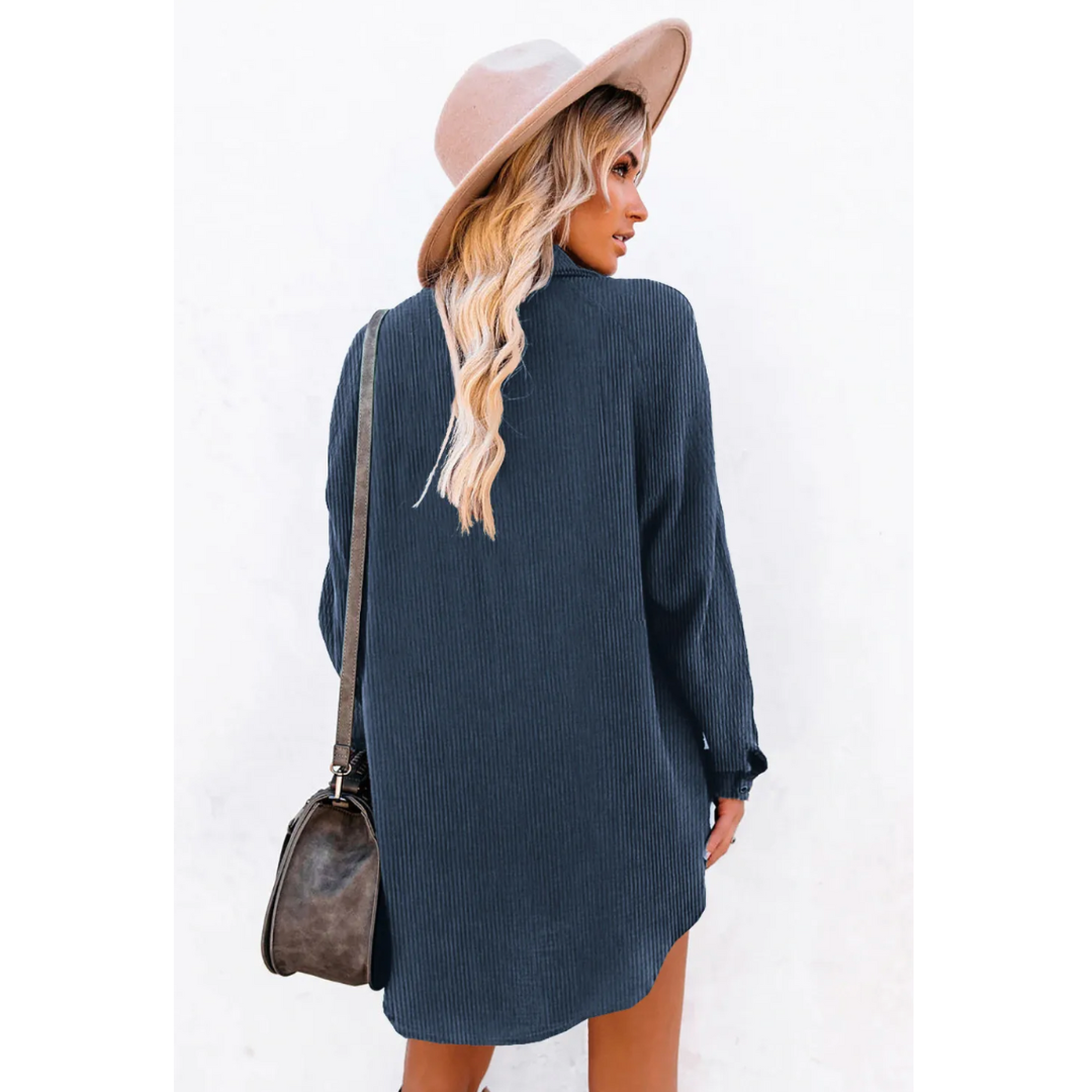 Meet your new wardrobe hero — the Wander & Unwind Shirt Dress! This effortlessly chic button-up dress features a relaxed fit, soft corded texture, and functional side pockets. Available in three versatile colors — Black, Denim Blue, and Light Olive — it’s the perfect throw-on-and-go piece for everything from weekend brunch to sightseeing strolls. The rolled cuffs and collared neckline add a polished touch to this casual must-have, and the longer hemline in the back provides just the right amount of coverage.