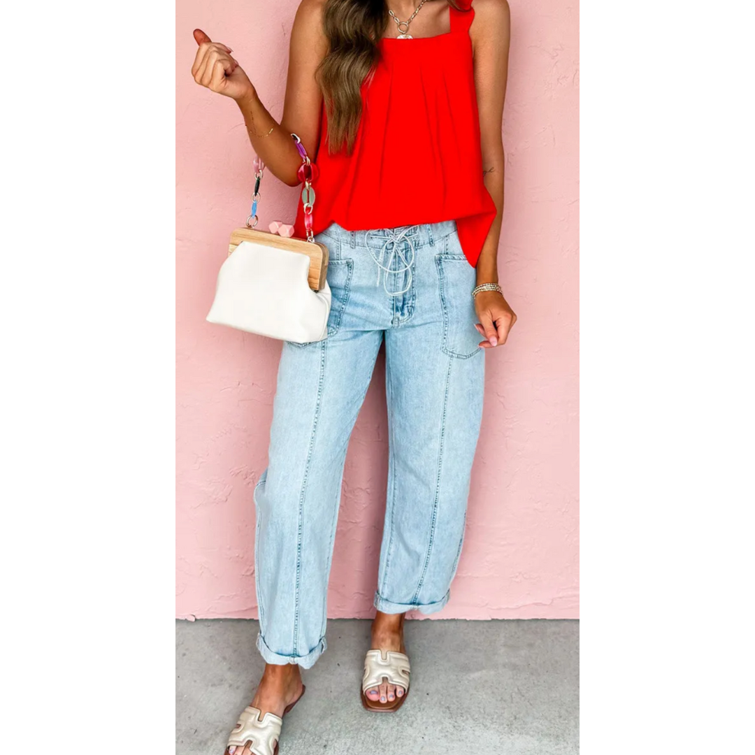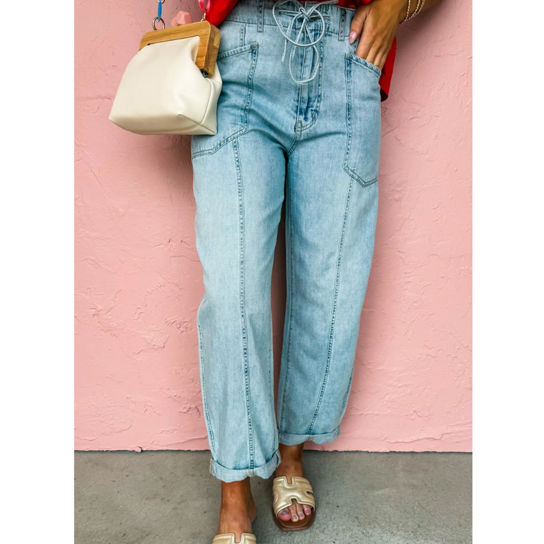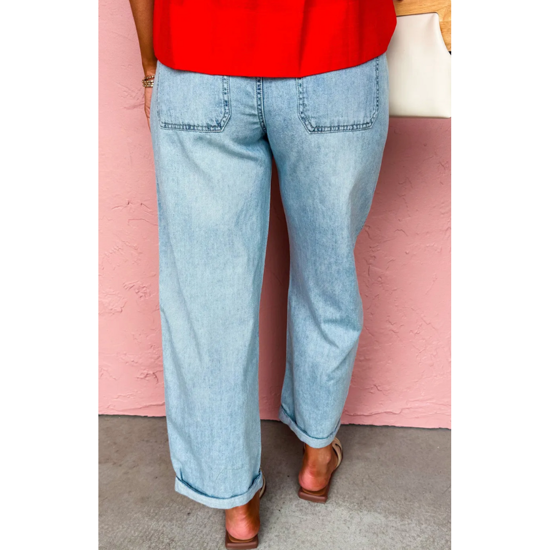 Relaxed, versatile, and effortlessly chic — the Weekend Escape Utility Jeans are your new go-to denim for laid-back days and casual outings. Designed in a light-wash denim, these jeans feature roomy front utility-style patch pockets, a flattering high-rise fit with adjustable drawstring detail, and straight-leg comfort with a roll-ready hem. The back patch pockets add extra practicality while keeping the look modern and cool. Perfectly pairing with tanks, tees, or cozy sweaters, these jeans strike the balance between everyday ease and elevated style.