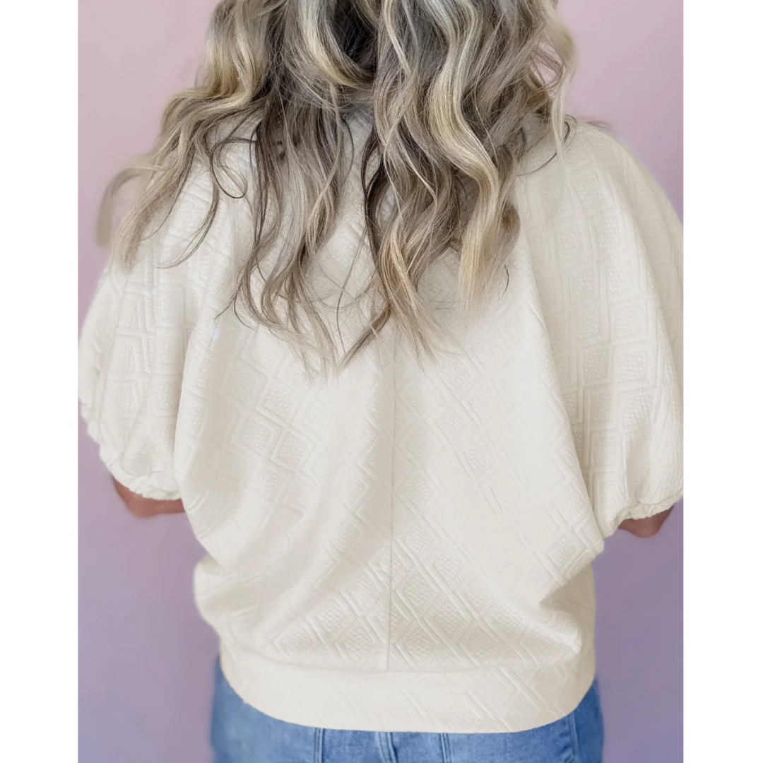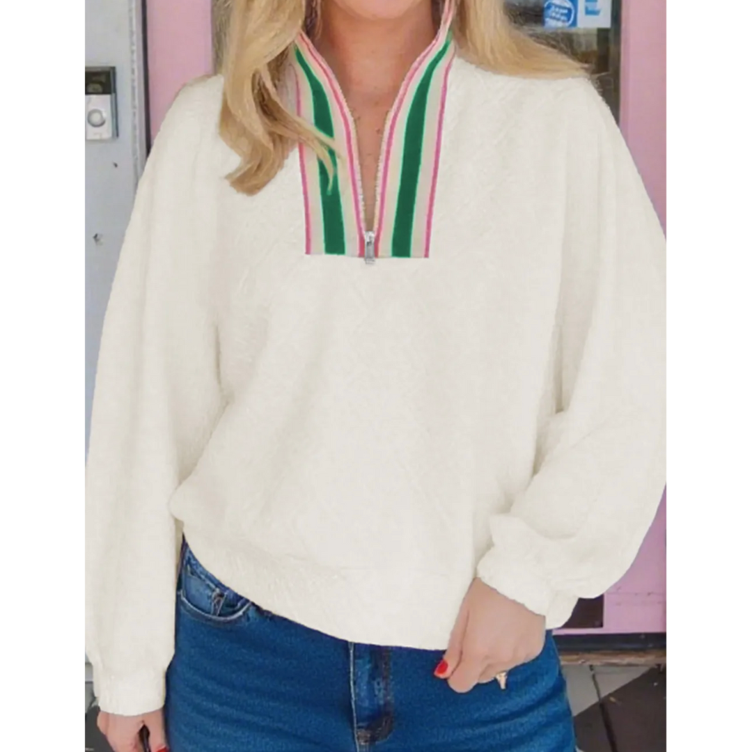 Effortlessly chic and endlessly versatile, the Weekend Stroll Quarter-Zip is the perfect blend of casual comfort and polished detail. Crafted in a soft ivory textured fabric with a subtle diamond pattern, this top features a relaxed fit and elastic hem for easy wear. The standout detail is the sporty quarter-zip neckline, lined with playful pink and bold green stripes, adding a fresh pop of color to a classic silhouette. Dress it up with jeans and sneakers for coffee runs or keep it cozy for weekend lounging.
