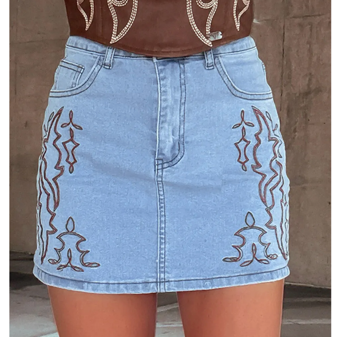 Channel modern cowgirl vibes with the Western Flair Denim Skirt—a playful mix of classic denim and bold embroidered patterns. This mini skirt is the perfect statement piece to elevate your casual looks with a touch of western-inspired charm. Pair it with a crop top, boots, or even a chic blouse for versatile styling all year round.