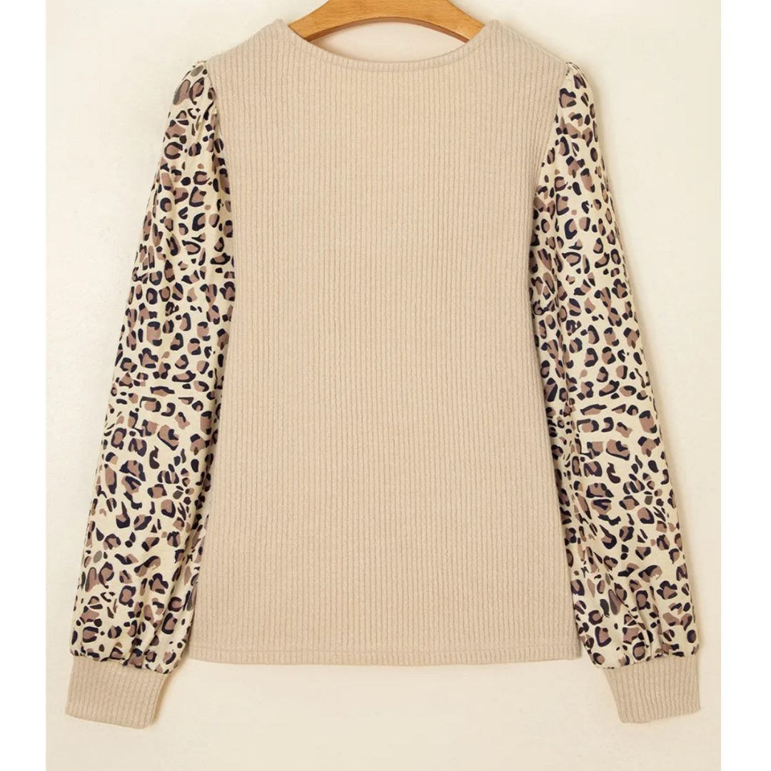 Turn heads with the Wild Chic Knit Top, where cozy meets fierce. Featuring a ribbed knit beige body that hugs comfortably and lightweight leopard-print balloon sleeves that bring a bold contrast, this piece is perfect for casual days with a touch of edge. The rounded neckline adds a flattering frame, while ribbed cuffs keep the voluminous sleeves neatly in place. Dress it up with jeans and booties or keep it laid-back with shorts—this top is your statement piece for every season.