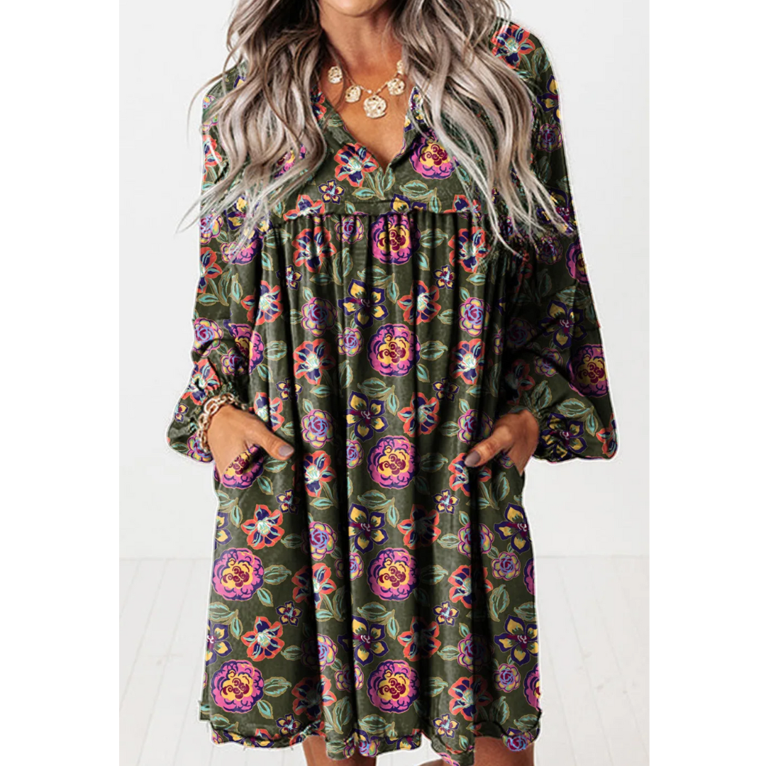 Step into effortless boho charm with the Wild Meadow Bloom Dress. Featuring a deep green base adorned with vibrant pink, purple, and coral florals, this relaxed-fit dress captures the beauty of a blooming garden. With a flowy silhouette, flattering V-neckline, and balloon sleeves, it’s the perfect balance of comfort and style. Hidden side pockets add everyday practicality while the lightweight fabric keeps it breezy and versatile—ideal for weekend brunches, strolls in the park, or casual evenings out.